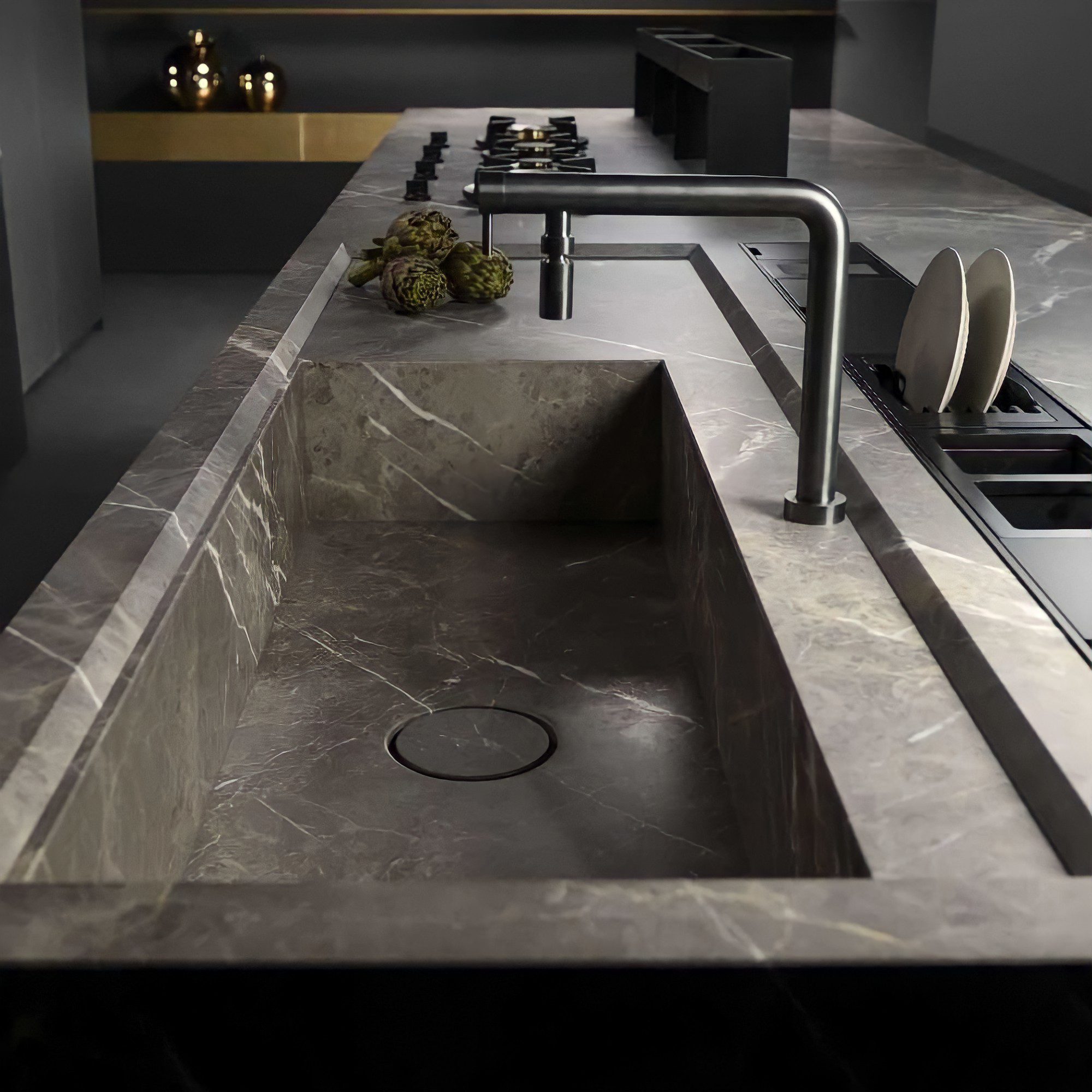 Berikutnya adalah built-in dari granit. Tampilannya memiliki satu bak cuci piring yang terbuat dari granit dan menyatu dengan meja dapur yang biasa Anda gunakan untuk menyimpan makanan yang telah siap saji yang selanjutnya akan dibawa ke meja makan.
