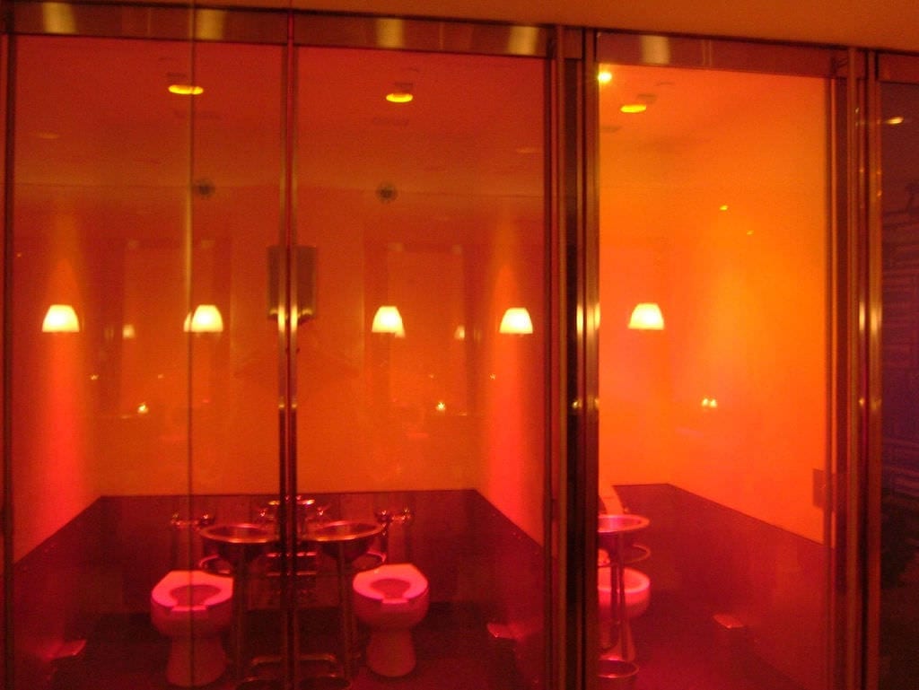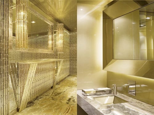 Mengapa toilet ini unik? Toilet ini begitu mewah ditambah dengan bambu emas yang melapisi dinding, cermin raksasa dan marmer; Dolce dan Gabbana tetap setia dengan nama high-classnya. Yang paling keren adalah Goldfinger yang bermain di dalam setiap tembok emas di layar plasma.