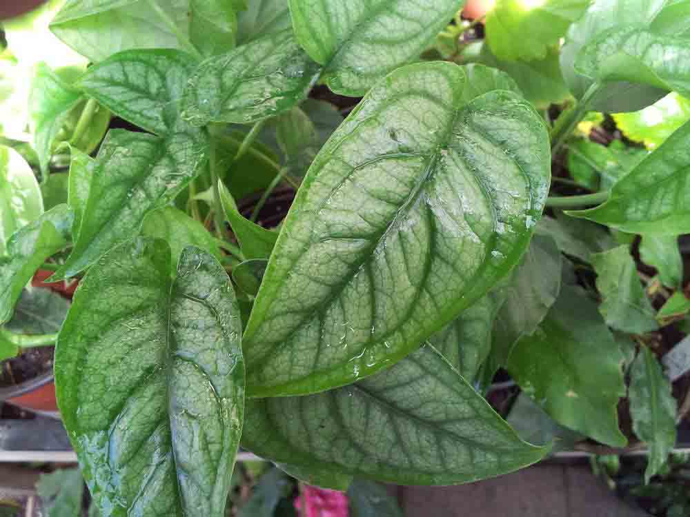 Tanaman ini memiliki daun yang sangat besar dan mengkilap, tetapi cenderung menumbuhkan celah, bukan lubang, yang mengarah ke tepi daun.