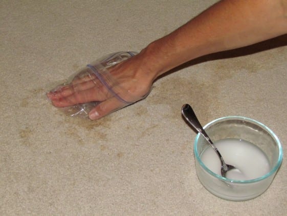 Tapi jika Anda sudah mencoba bahan yang lain selain ammonia dan tidak ada yang berhasil, Anda bisa mencampur satu sendok makan amonia dan secangkir air hangat bersama. Gosok larutan tersebut ke karpet yang masih terdapat sisa muntahannya menggunakan handuk putih kering bersih.