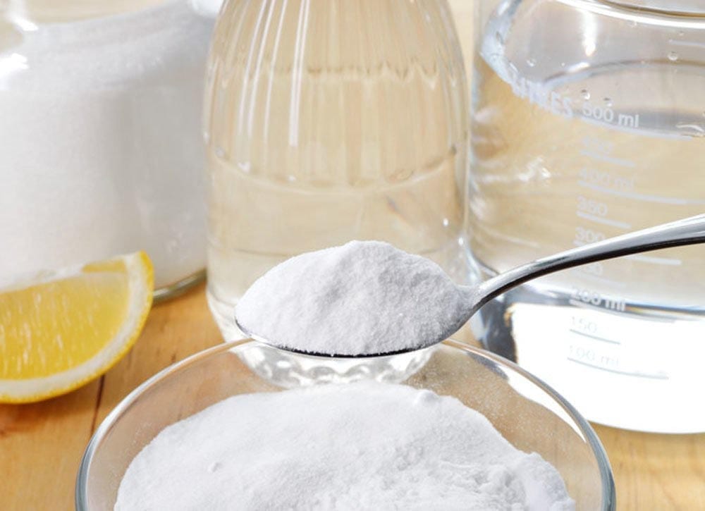 Tuangkan 1/4 baking soda ke dalam ember yang telah berisi 50 ml air hangat, aduk campuran ini hingga membentuk pasta. Setelah itu, oleskan pasta pada bagian yang bernoda dan diamkan selama 10-15 menit.