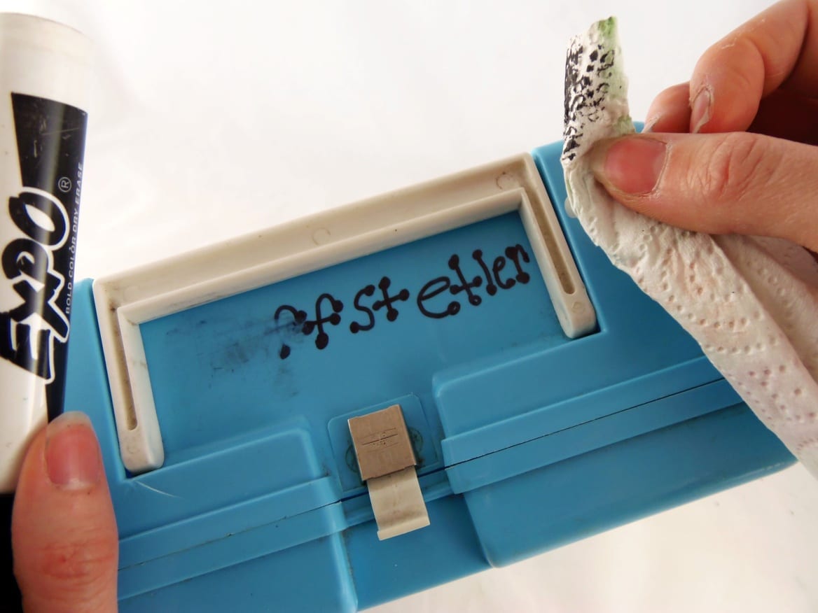 Anda bisa menggunakan penghapus pensil, tabir surya atau alkohol untuk menghilangkan tinta marker permanen dari plastik.