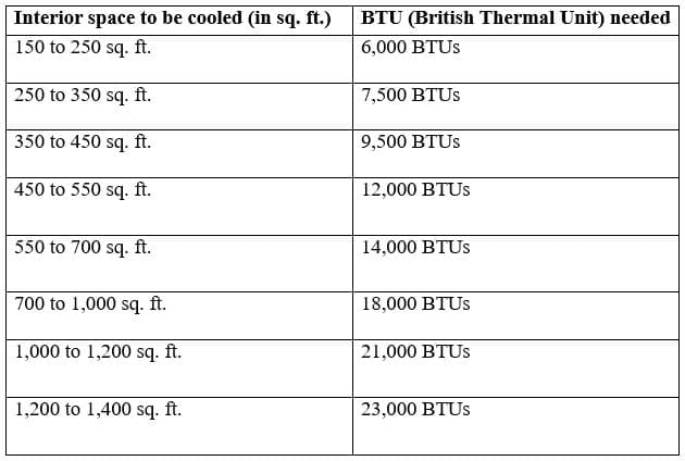 Kapasitas pendinginan yang diperlukan untuk pendingin ruangan tergantung pada ukuran ruangan yang didinginkan. AC ruangan umumnya memiliki kapasitas pendinginan yang berkisar dari 5.500 Btu per jam hingga 14.000 Btu per jam.