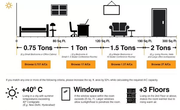 -Dengan menggunakan ukuran luas dan bagan di bawah ini, tentukan kapasitas pendinginan yang benar. Kapasitas pendinginan diukur dalam British thermal units (BTUs) per jam.