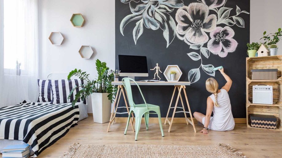 Cara termudah untuk mendesain ruang kost Anda adalah dengan mengecat ulang tembok Anda atau memberikannya sedikit tempelan wallpaper yang akan menambah nilai seni dari ruang kost Anda.