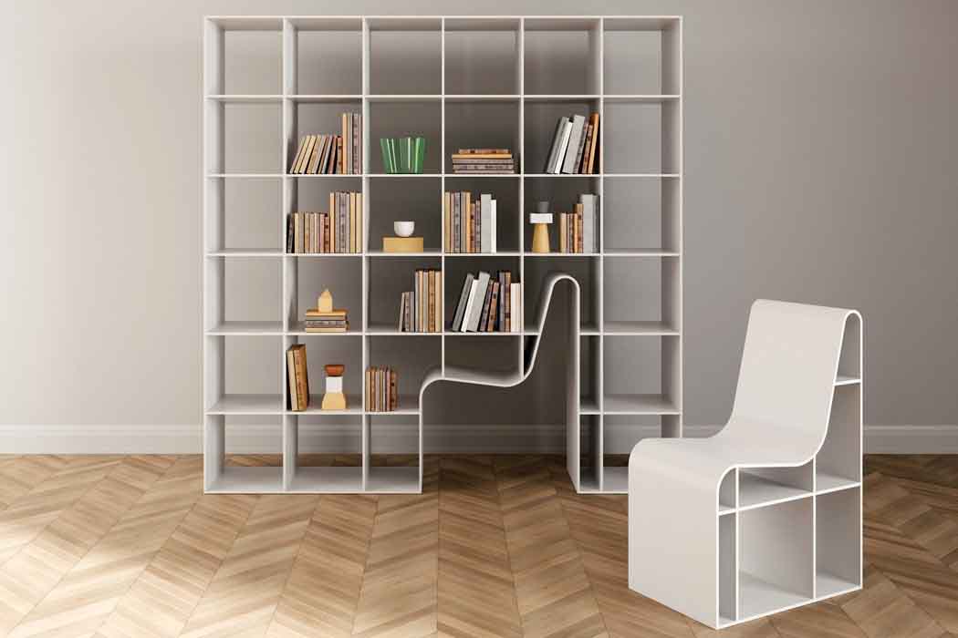 Desain rak buku selanjutnya yaitu rak buku berbentuk kursi. Selain unik, rak buku ini juga memiliki fungsi lainnya yang mana Anda dapat mengambil buku pada bagian kursi yang menjadi rak buku, lalu duduk di kursi untuk membaca buku yang Anda pilih untuk Anda baca.