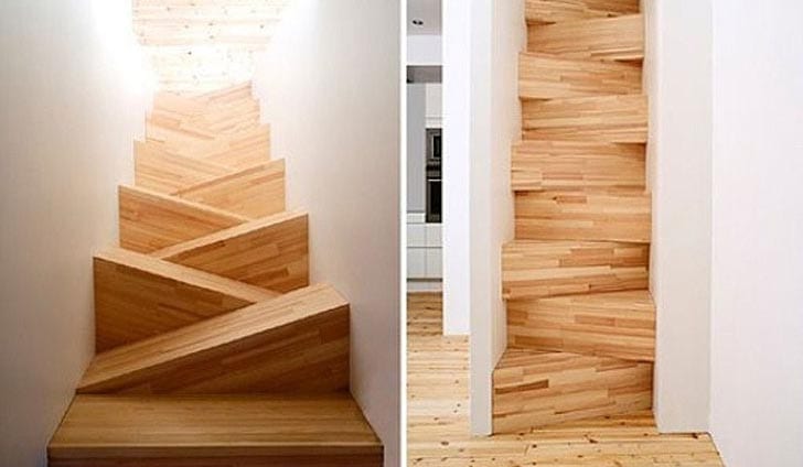 Pada umumnya, tangga memiliki desain pijakan dengan bentuk persegi. Berbeda dengan tangga yang satu ini, Anda akan mendapatkan pijakan tangga berbentuk segitiga. Hah, kok bisa? Bisa dong!
