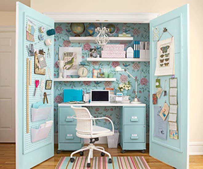 Jika Anda kesulitan menempatkan meja karena keterbatasan space, manfaatkan ruang kerja dengan bentuk lemari seperti ini, anda hanya perlu menempatkan kursi kerja saja pada meja berbentuk lemari ini. Jika sedang tidak digunakan, ruang kerja ini bisa Anda tutup dan akan menyerupai lemari pakaian. Model ruang kerja ini cocok diaplikasikan di dalam kamar.