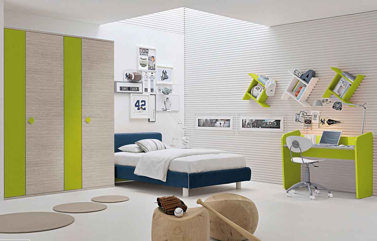 Perpaduan antara warna hijau dan unsur kayu akan membuat nuansa kamar terasa lebih sejuk dan alami. Anda bisa memilih perabot seperti ranjang tingkat, lemari, serta lantai dengan dua tema tersebut, sedangkan dindingnya bisa Anda pilih dengan unsur putih untuk mengimbangi suasana kamar anak ini.