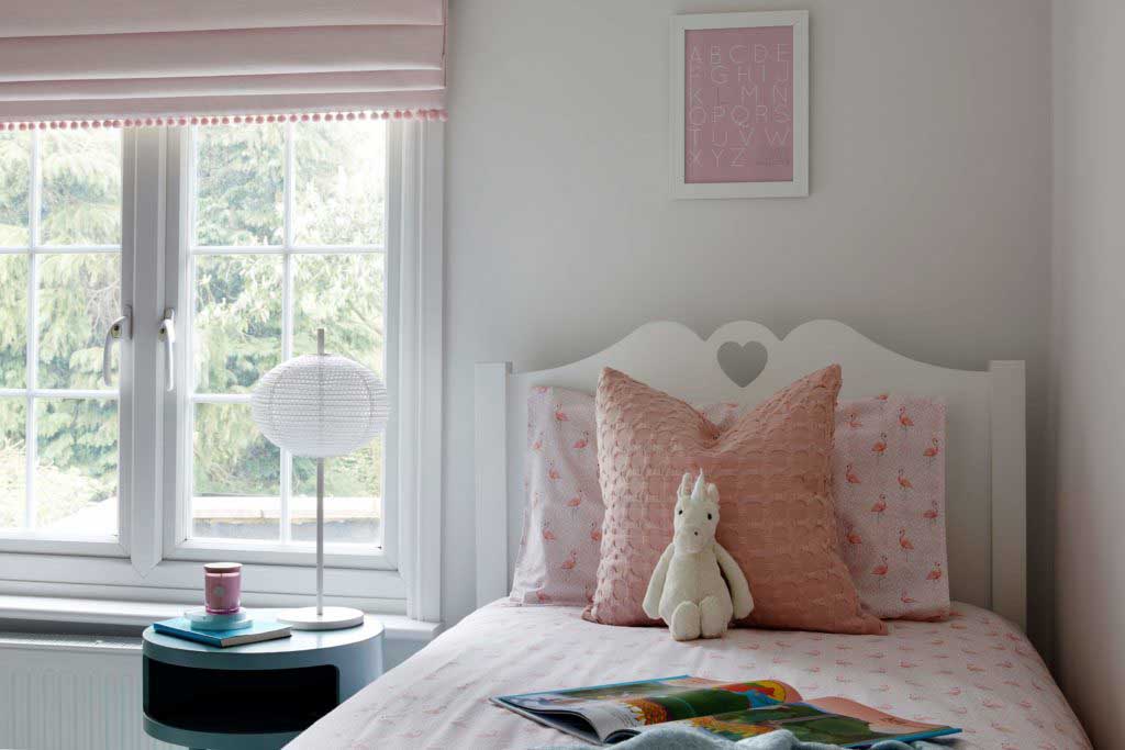 Warna dinding putih membuat desain kamar sangat lekat dengan nuansa minimalis. Berbeda dengan warna pinknya yang mewakili karakter anak perempuan sehingga dekorasinya terlihat lebih tematik.