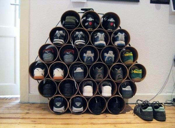 Model rak sepatu yang ketiga ini cukup unik karena terbuat dari pipa pipa saluran air yang dimanfaatkan menjadi tempat penyimpanan sepatu.