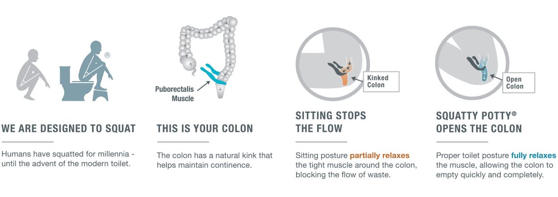 Ketika kita berdiri, tingkat lengkungan ini yang biasa disebut sudut anorektal yaitu sekitar 90 derajat yang menempatkan tekanan ke atas pada rektum dan menyimpan kotoran di dalamnya, akan menjadi lurus ketika posisi kita berjongkok. Hal ini menyebabkan buang air besar menjadi lebih mudah.