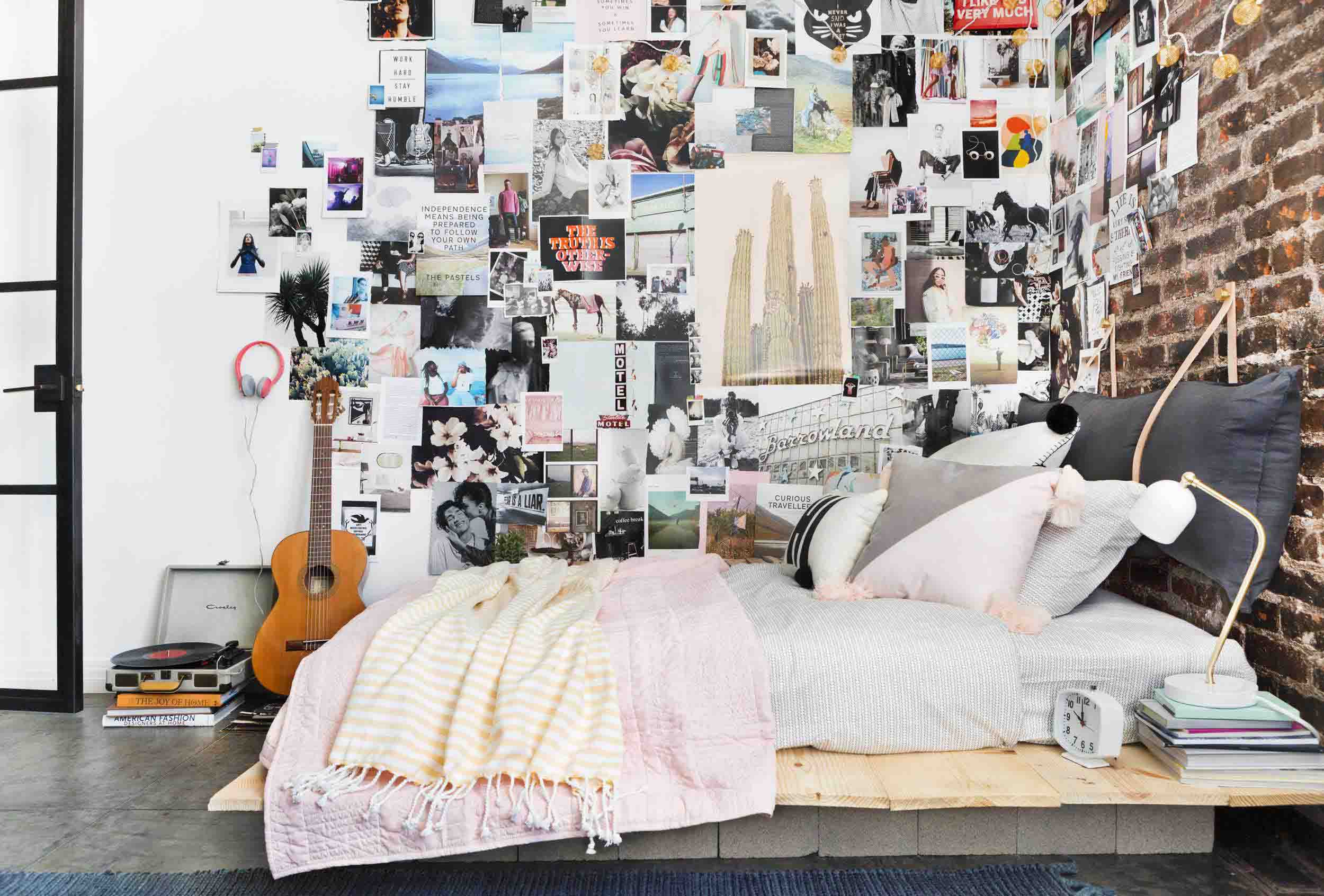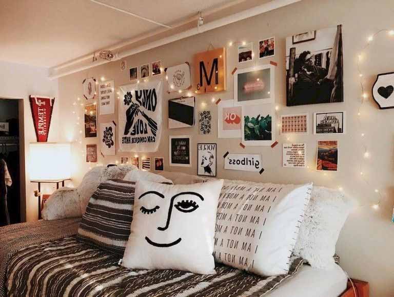 Pajangan pada dinding kamar juga bisa Anda gunakan dalam melakukan dekorasi kamar kos. Pajangan ini bisa berupa berbagai macam lukisan mini yang sederhana, bisa juga dengan memajang foto foto Anda bersama teman atau keluarga supaya menambah kesan manis pada kamar Anda, dengan dihiasi lampu tumblr yang bisa Anda tempelkan di dinding dekat dengan foto-foto.