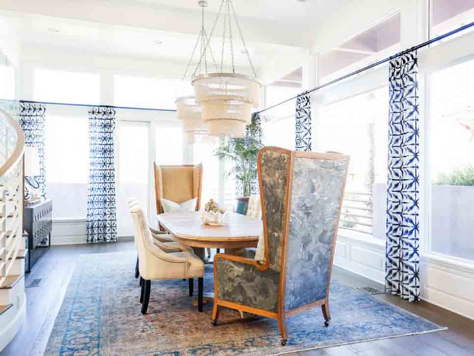 Gunakan tirai dengan pola tambahan nada yang sama merupakan cara yang efektif untuk menambahkan sisi grafis yang menyegarkan sambil melunakkan pilihan warna Anda yang terkesan berani.